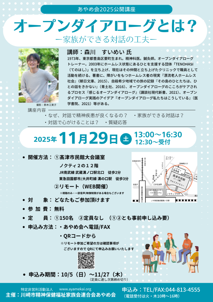 特定非営利活動法人川崎市精神保健福祉家族会連合会あやめ会は令和7年度通常総会をエポックなかはら(川崎市総合福祉センター)で開催します。
